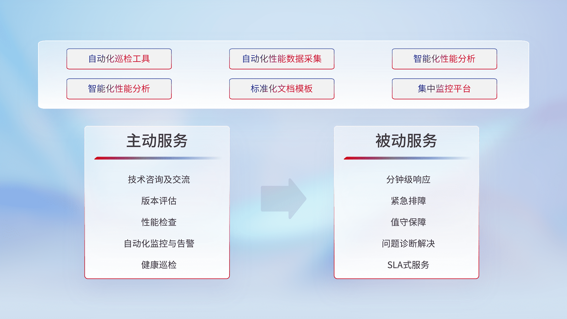 智能化工具和标准化文档,,,保障服务质量,,,提供主动服务(包含技术咨询、、版本评估、、性能检查、、、自动化监控与告警、、健康巡检)和被动服务包含(分钟级响应、、紧急排障、、、、值守保障、、、、问题诊断解决、、SLA服务)。。